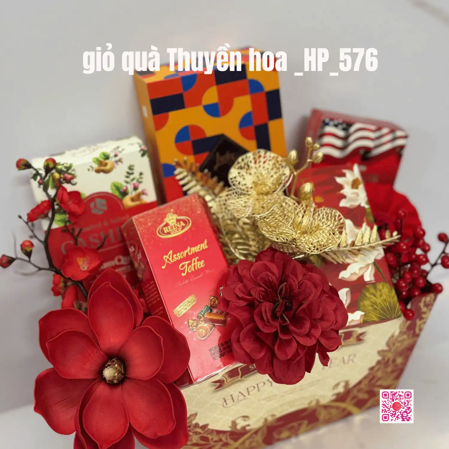 Giỏ quà được thiết kế theo dáng giỏ thuyền, tông vàng chủ đạo, kết hợp họa tiết Tết và trang trí mai – đào, tạo nên diện mạo sang trọng và ấm áp. Các sản phẩm bên trong được chọn lọc kỹ, hài hòa về màu sắc và hương vị, phù hợp sử dụng làm quà biếu Tết cho doanh nghiệp và gia đình.