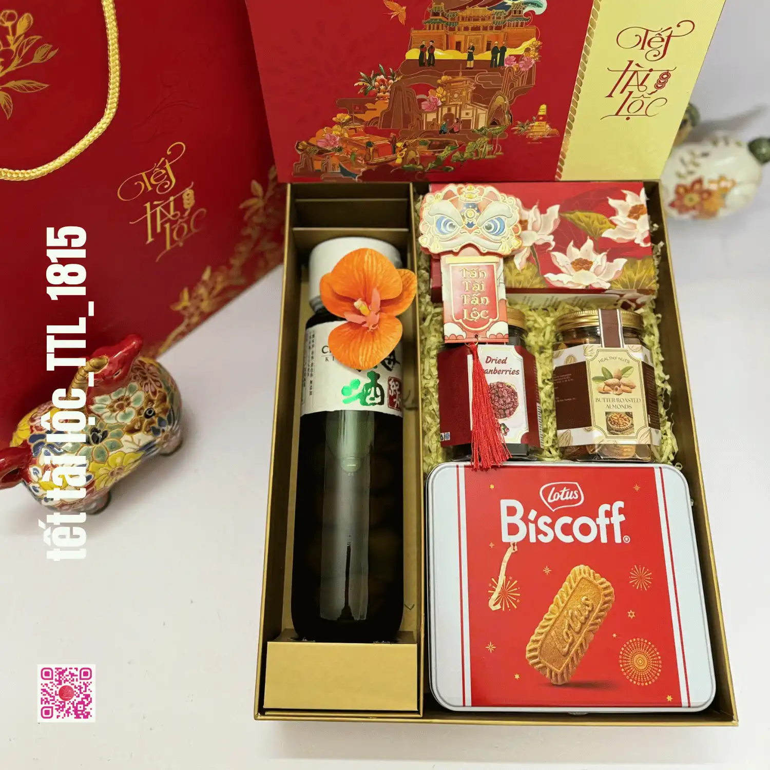 Tết Tài Lộc là hộp quà gửi gắm lời chúc năm mới sung túc, thịnh vượng và hanh thông. Sự kết hợp giữa rượu vang châu Âu, bánh kẹo nhập khẩu cùng nông sản Việt Nam chọn lọc tượng trưng cho tài lộc hội tụ, đủ đầy hương vị – thích hợp làm quà biếu đối tác, khách hàng và người thân trong dịp đầu năm.