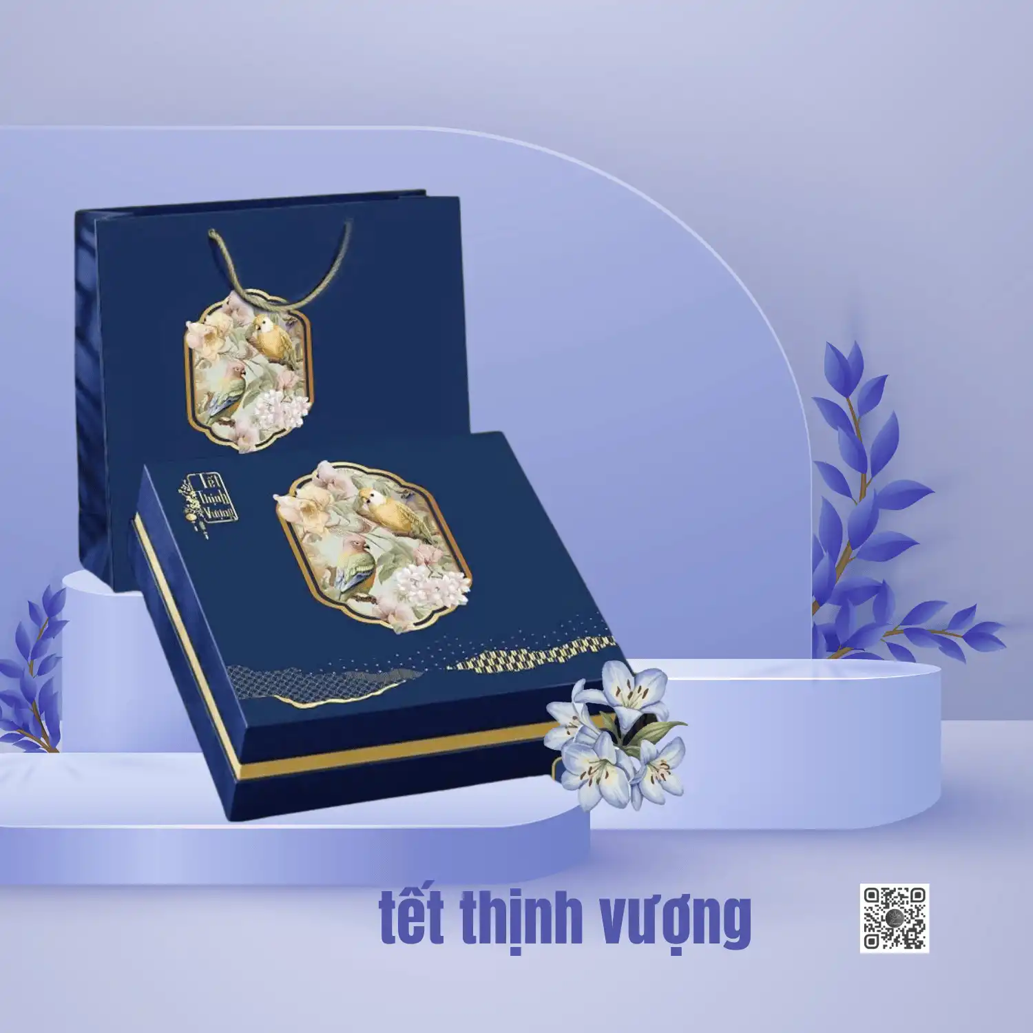 Trên nền xanh hoàng gia trầm sang, bộ đôi hoa xuân – loài chim báo điềm lành được minh hoạ theo phong cách hội họa cổ điển, tạo nên vẻ đẹp vừa mềm mại vừa quyền quý. Khung viền vàng ánh kim và mảng họa tiết cách điệu ở cạnh hộp giúp tổng thể nổi bật, chỉnh chu từ xa đến gần.